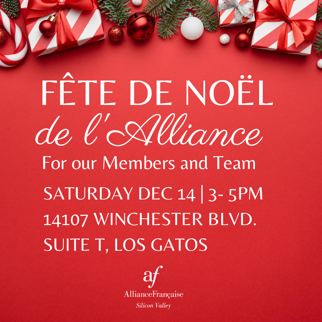 We are grateful to all our members for their support and sustained participation. On the occasion of the end of year celebrations, the Alliance Française Silicon Valley invites all its members to a Holiday Party on Saturday December 14, 2024 from 3pm to 5pm.