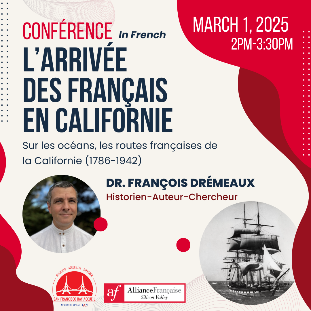 The Arrival of the French in California Across the Oceans: French Routes to California (1786-1942) - a lecture at the Alliance Française of Silicon Valley by François Drémeaux, historian-author-researcher. For a long time, the journey to the United States was primarily a maritime adventure. And to reach California, there were numerous possibilities. Exploration missions, regular lines, world tours, or military stopovers, this lecture aims to trace the journeys that brought the French and their ships to the shores of the American West.