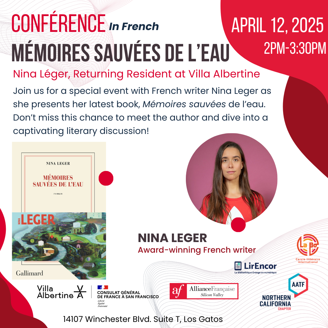 La Villa Albertine, l’Association des American Teachers of French (AATF), la Bibliothèque Orange et le Cercle Littéraire International, en partenariat avec l’Alliance Française Silicon Valley, vous invitent à une rencontre exceptionnelle en présence de l’autrice française Nina Léger, à l’occasion de la parution de son dernier roman, Mémoires sauvées de l’eau (Éditions Gallimard, 2024).so